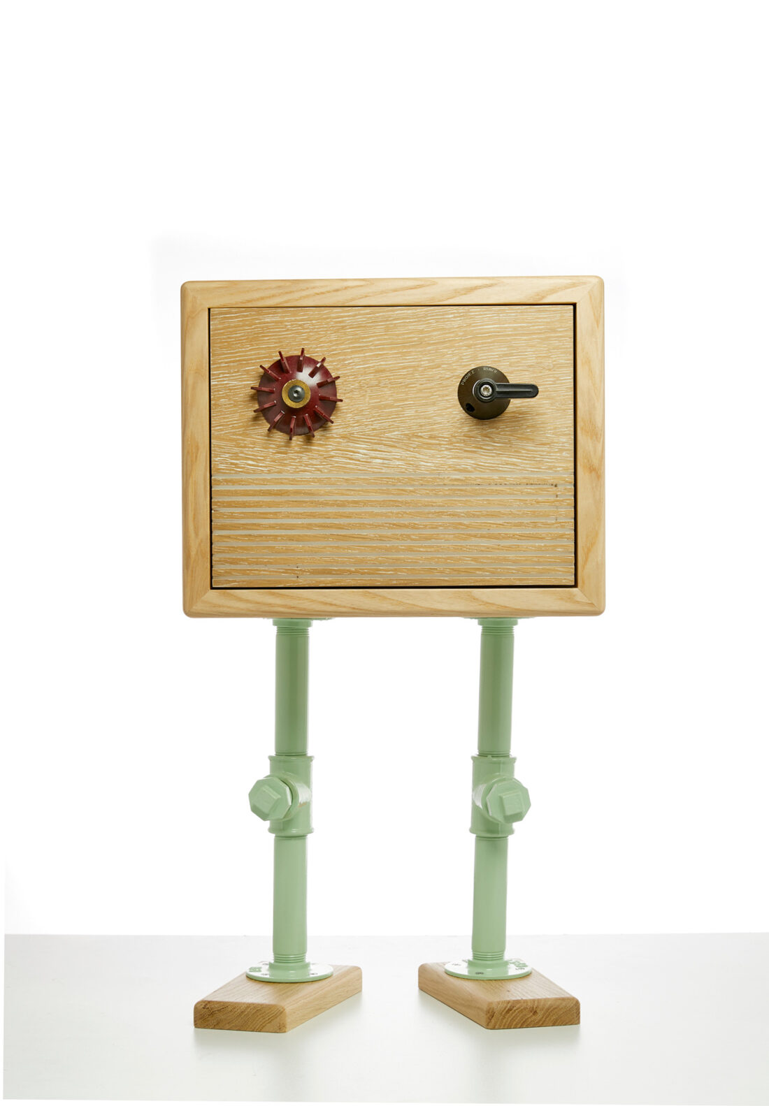 Anta in listellare di rovere con parti di un vecchio proiettore cinematografico come pomelli.